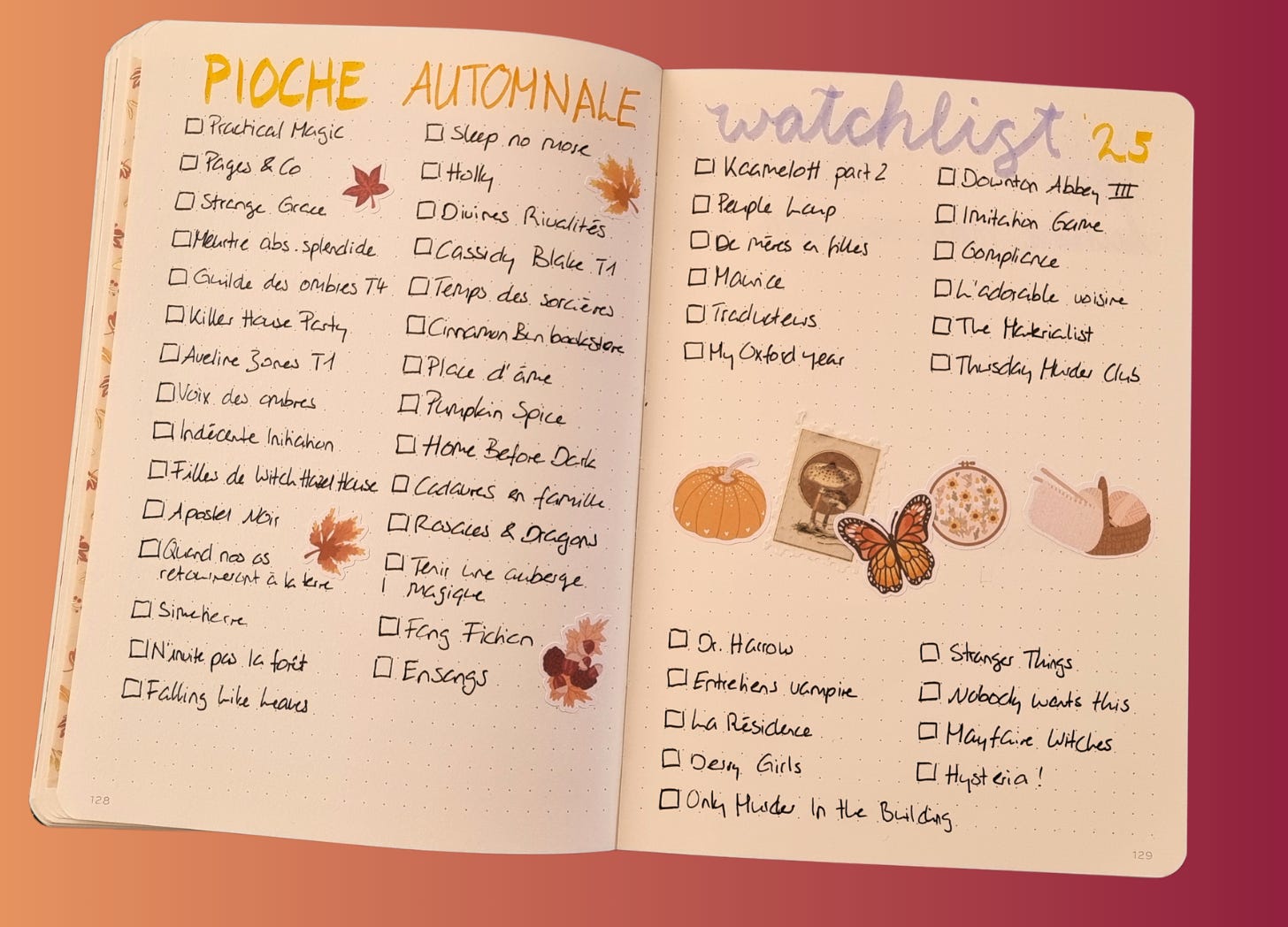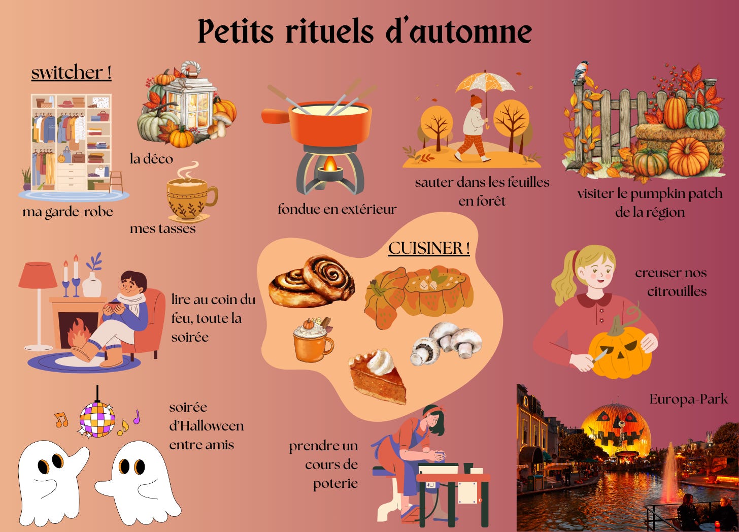 Ă faire, Ă lire et Ă voir. Je rythme toujours les saisons avec des pâtites listes. DĂ©jĂ , jâaime juste les faire. Voir ces cases que je vais pouvoir cocher ça me provoque un truc Et ensuite, jâaime beaucoup vivre, du mieux que je peux, selon les saisons. Ăa rend quelque chose dâunique, de passager et nous rappel dâen profitĂ© tant que câest encore la pĂ©riode. Et pour moi, rien de tel que de me plonger dans un bon roman, ou un film qui colle Ă la mĂ©tĂ©o qui fait dehors. Ăa me donne la sensation dâĂȘtre totalement prĂ©sente dans lâinstant.